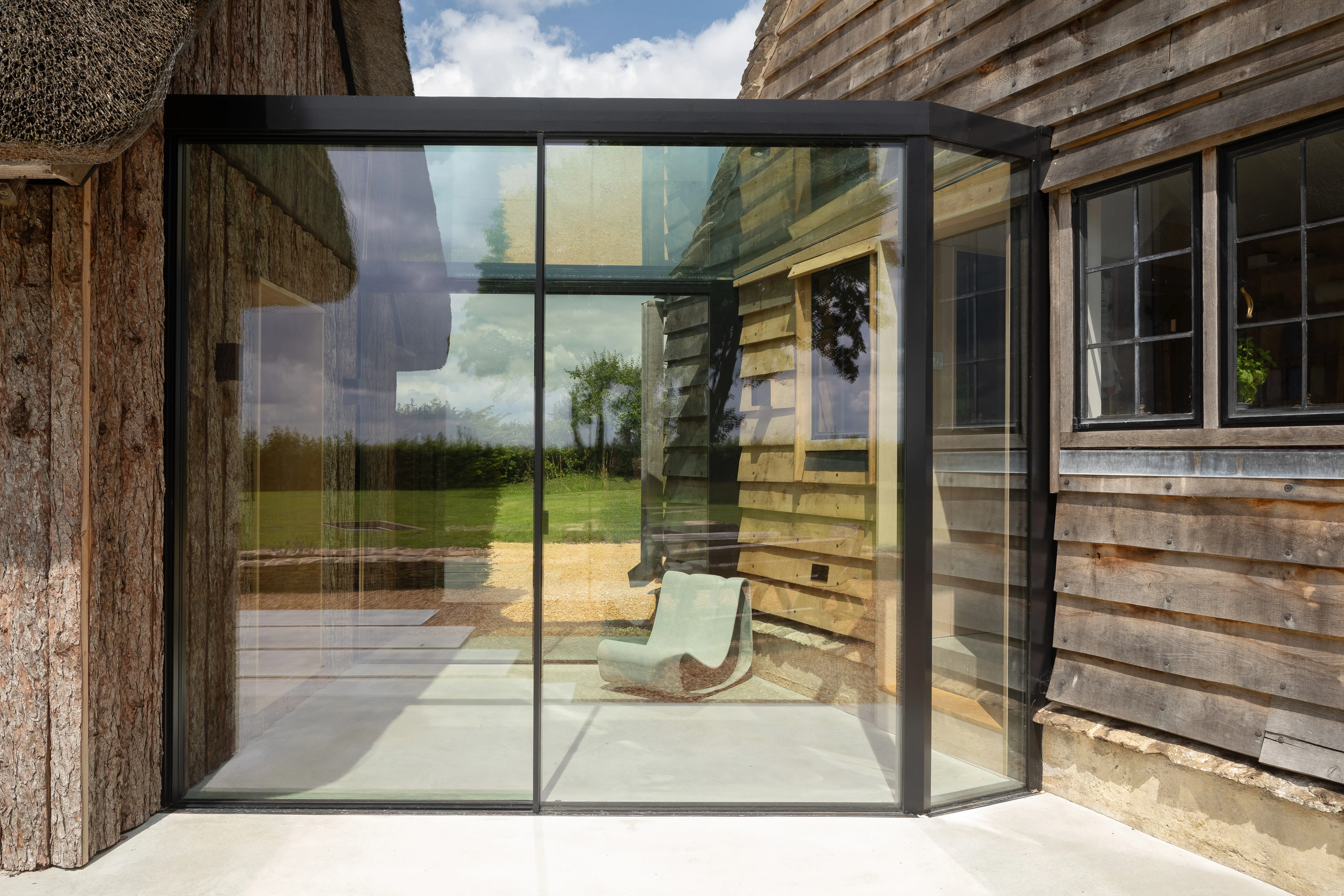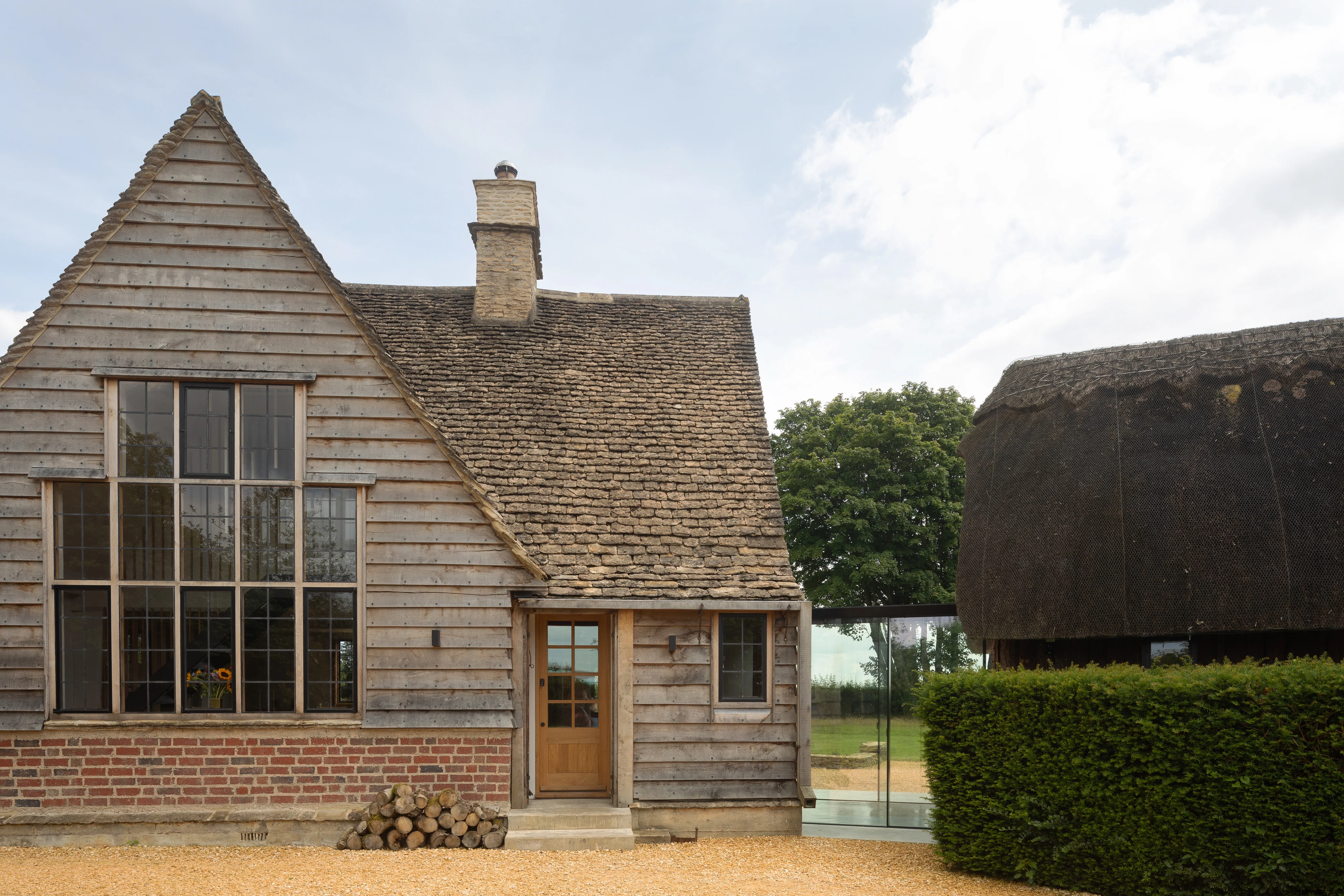 La tâche était aussi exigeante que complexe. Deux constructions en bois largement délabrées et classées monuments historiques – un cottage et un atelier au toit de chaume – devaient être réunis en une seule maison familiale sans perdre leur caractère historique. L'architecte Rebecca Milton, alors propriétaire des lieux, élabora la vision initiale du projet et obtint les autorisations patrimoniales. Une photographie d'époque, prouvant que les deux bâtiments avaient autrefois été physiquement reliés, constitua la clé décisive. Ashton Architecture reprit le projet en 2020 et le mena à terme en collaboration avec le nouveau propriétaire – une réalisation récemment distinguée par un RIBA Regional Design Award.