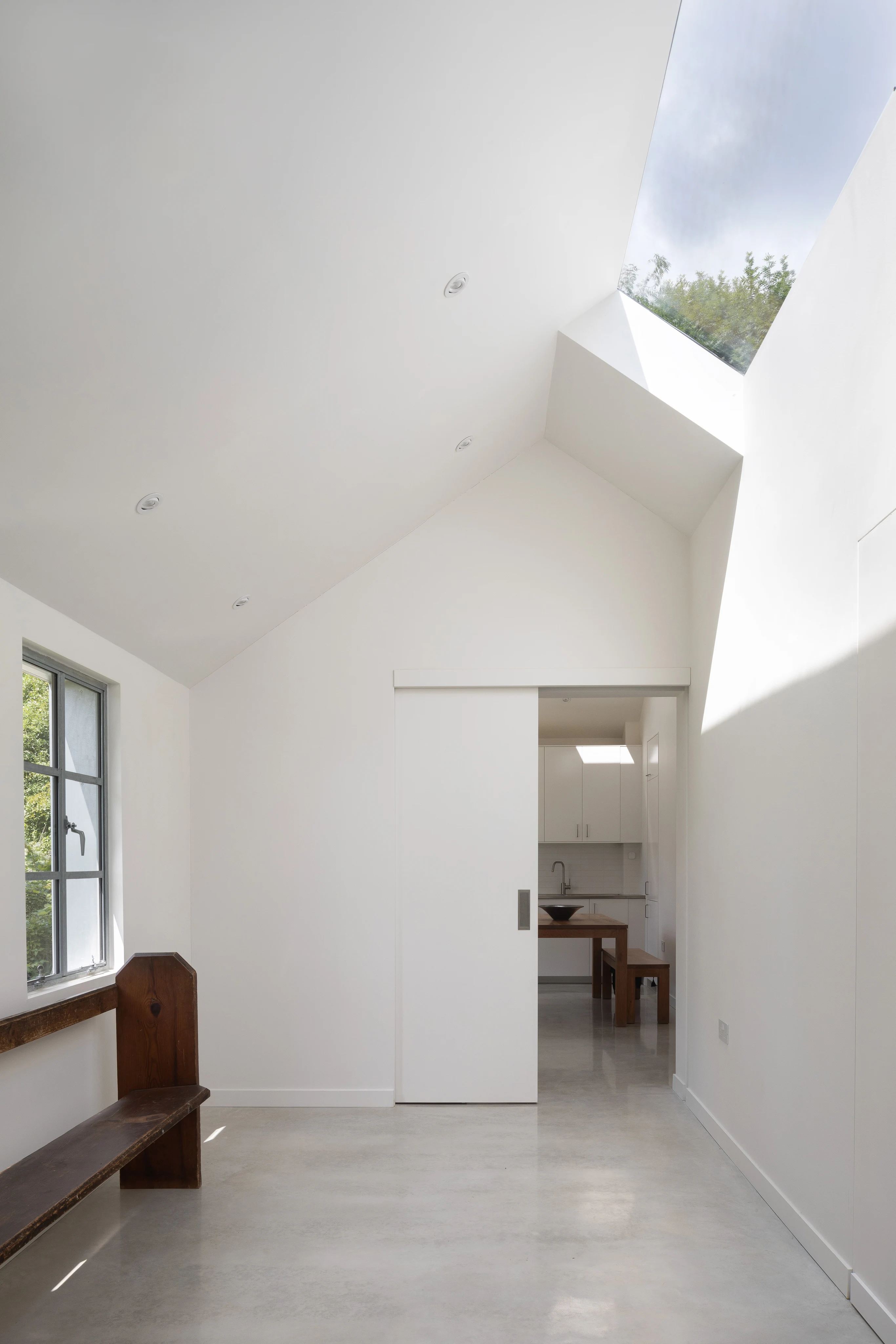 La mise au jour minutieuse de strates cachées révéla des surprises que seules la patience et la persévérance permettent de découvrir. Derrière d'anciens revêtements apparurent des ouvertures et des fenêtres d'origine. Une grande fenêtre dissimulée sur la façade nord fut rétablie, restituant au séjour en double hauteur du cottage sa générosité première. Les bardages en bois noircis à la créosote furent poncés, la maçonnerie peinte dégagée – un retour délicat vers des finitions plus naturelles et plus claires, offrant aux espaces une légèreté nouvelle.