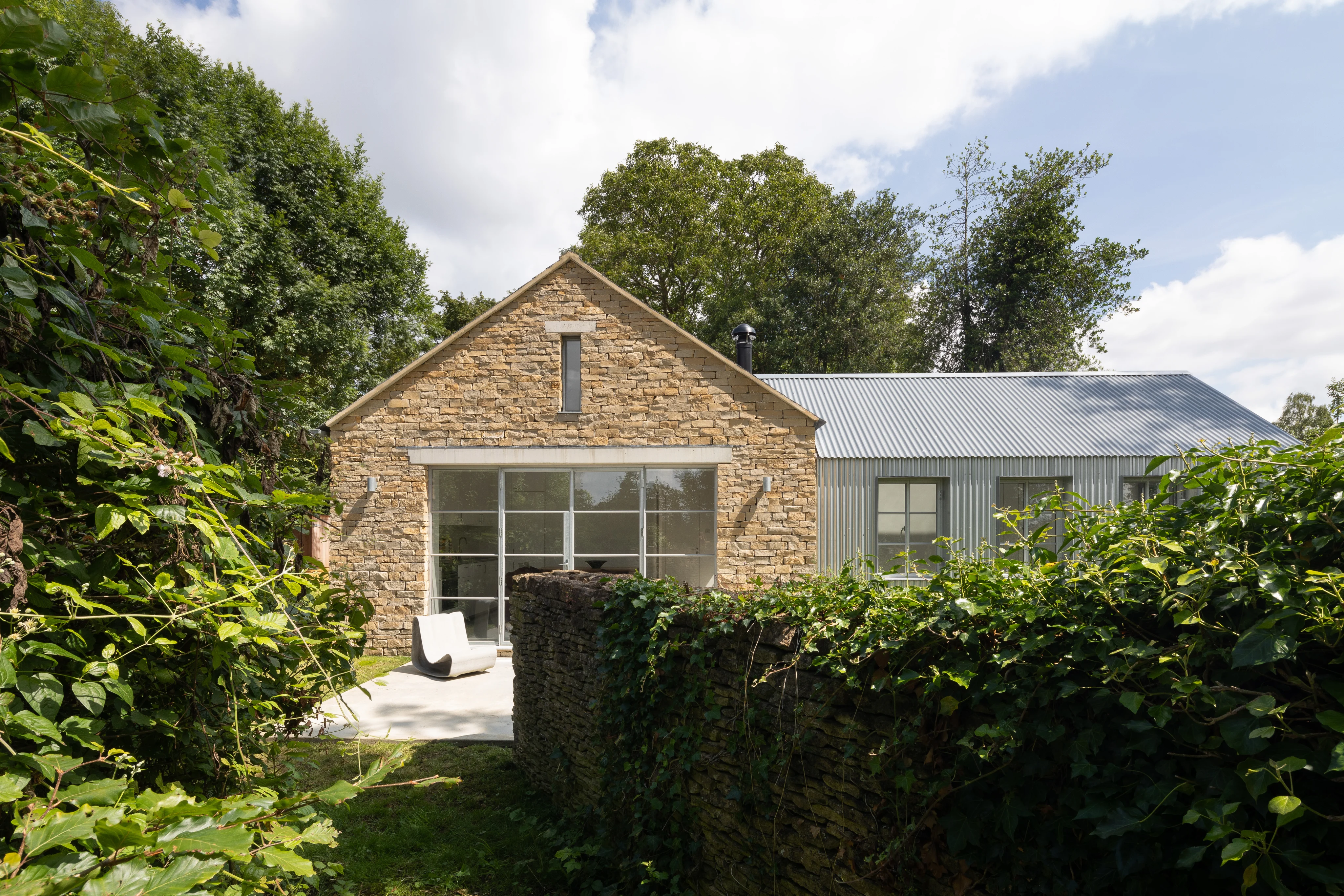 À l'écart des bâtiments historiques, dissimulée par des arbres matures et des haies, une nouvelle dépendance complète l'ensemble. Son architecture – un jeu de volumes à toitures en pente, en pierre des Cotswolds à joints ouverts et bardage en tôle ondulée galvanisée – répond à son environnement avec une assurance discrète. Portes et fenêtres galvanisées, ainsi que des portes coulissantes habillées de bois dont les mécanismes restent volontairement apparents, allient expression artisanale et clarté fonctionnelle. Chambre d'amis, bureau et espaces annexes trouvent ici leur place sans grever le patrimoine classé.